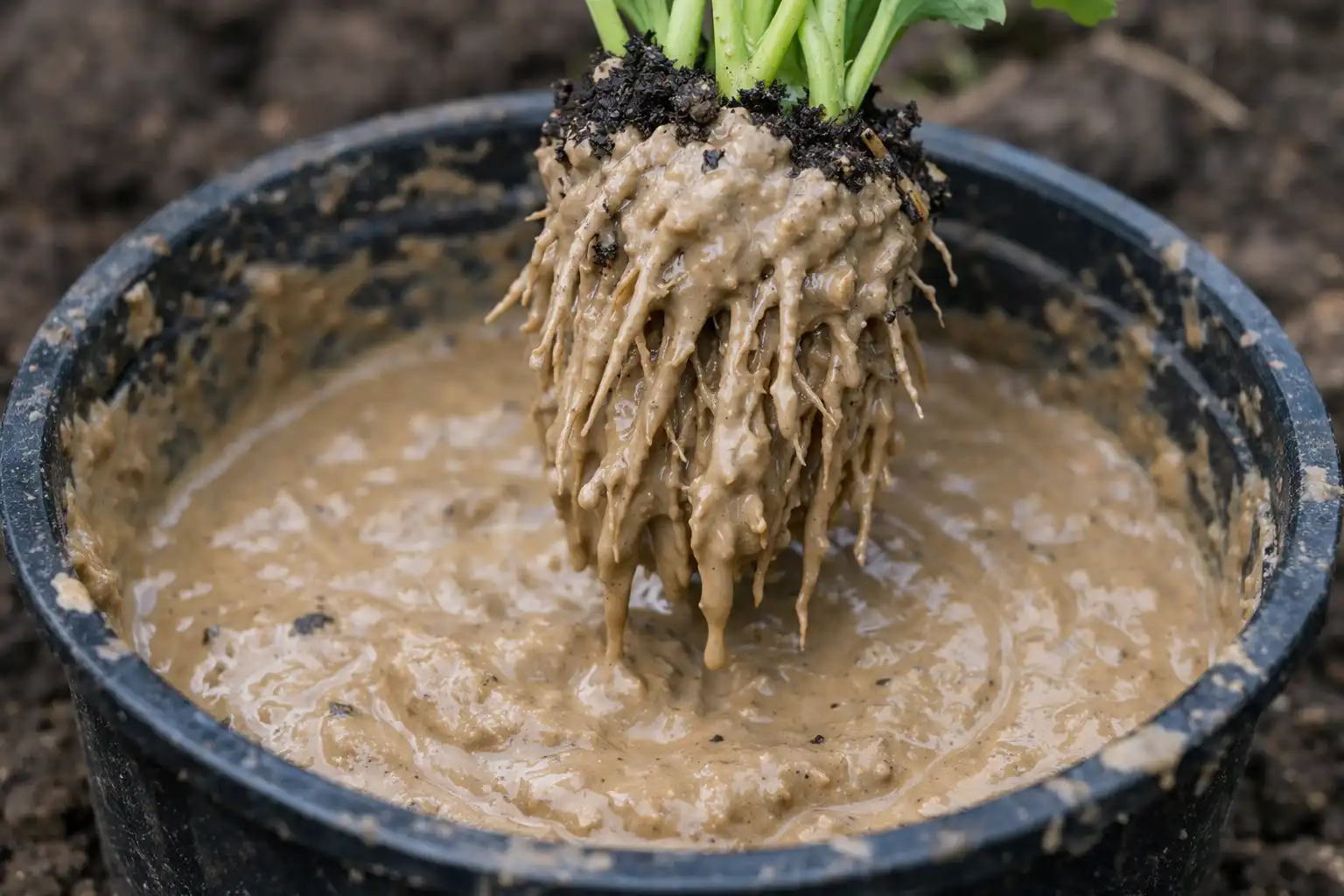Blanda helt enkelt lera och vatten till en konsistens som tjock gräddfil. Om du har humus kan du tillsätta den i blandningen. Doppa rötterna på varje planta i blandningen och se till att leran täcker dem jämnt. Detta lera skorpa skyddar rötterna från att torka ut och säkerställer en tät kontakt med jorden, vilket är avgörande för rotning och vidare tillväxt.