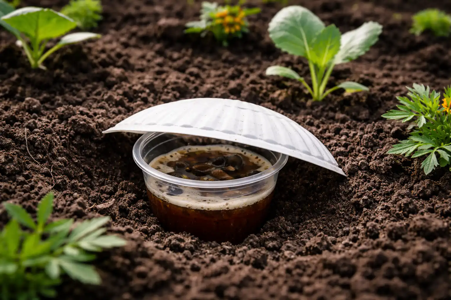 – Gräv ner små plastmuggar i jämnhöjd med marken. – Fyll dem till en tredjedel med mörk öl eller en blandning av vatten, jäst och socker. – Täck överdelen med en halv engångstallrik för att förhindra att regn tränger in. – Kontrollera och rengör behållarna varje morgon.
