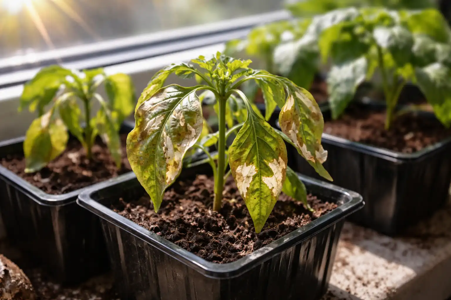Det största misstaget hos grönsaksodlare är den plötsliga överföringen av växter från skuggan till starkt ljus. Paprikans bladplatta är mycket känslig och solbränna framträder som vita fläckar som så småningom blir till hål. För att undvika detta kan man använda metoden med gradvis anpassning eller ”skuggande skärm”.