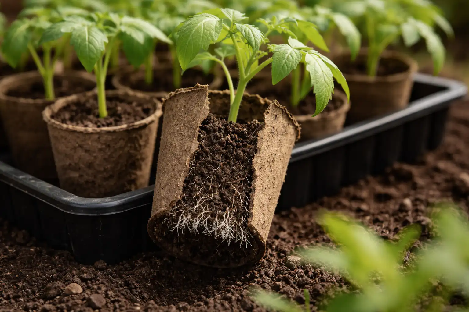 En väl förberedd torvkruka blir ett näringsrikt medium som ger tomaterna en kraftig tillväxtspurt direkt efter planteringen.