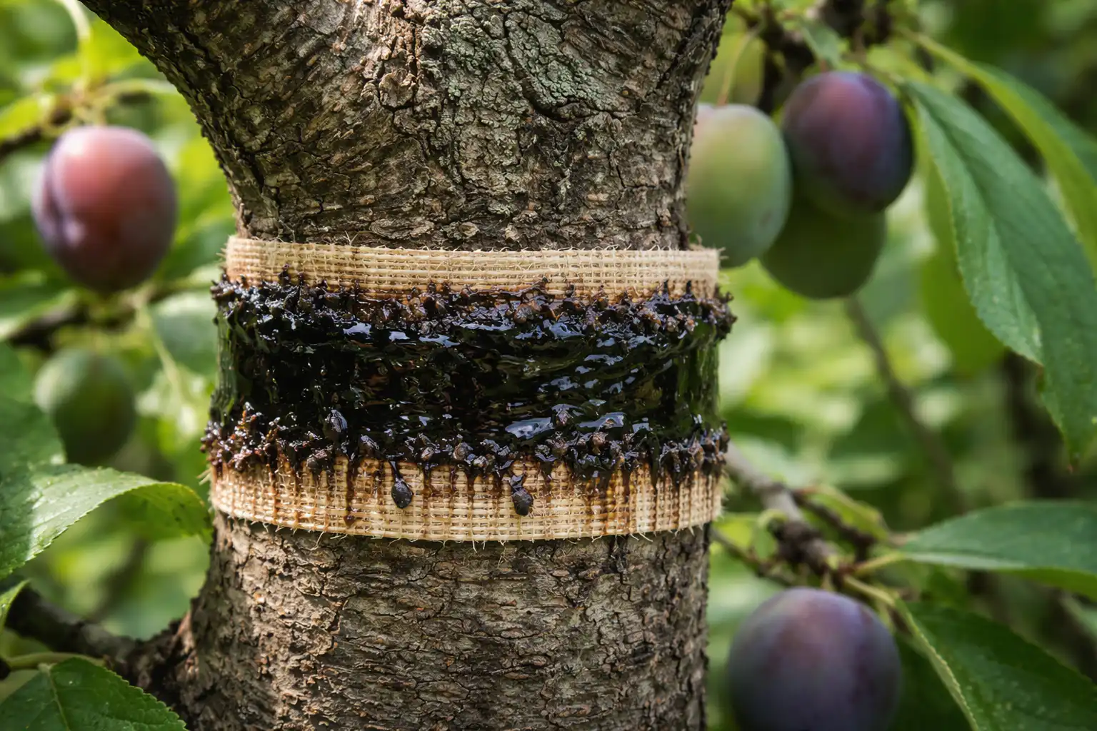 För att skapa ett bälte lindar du en 15 centimeter bred trasa i knähöjd runt plommonträdets stam. Blötlägg trasan i ren tjära, men var försiktig så att du inte får det på själva barken (i koncentrerad form kan det orsaka brännskador på unga träd).