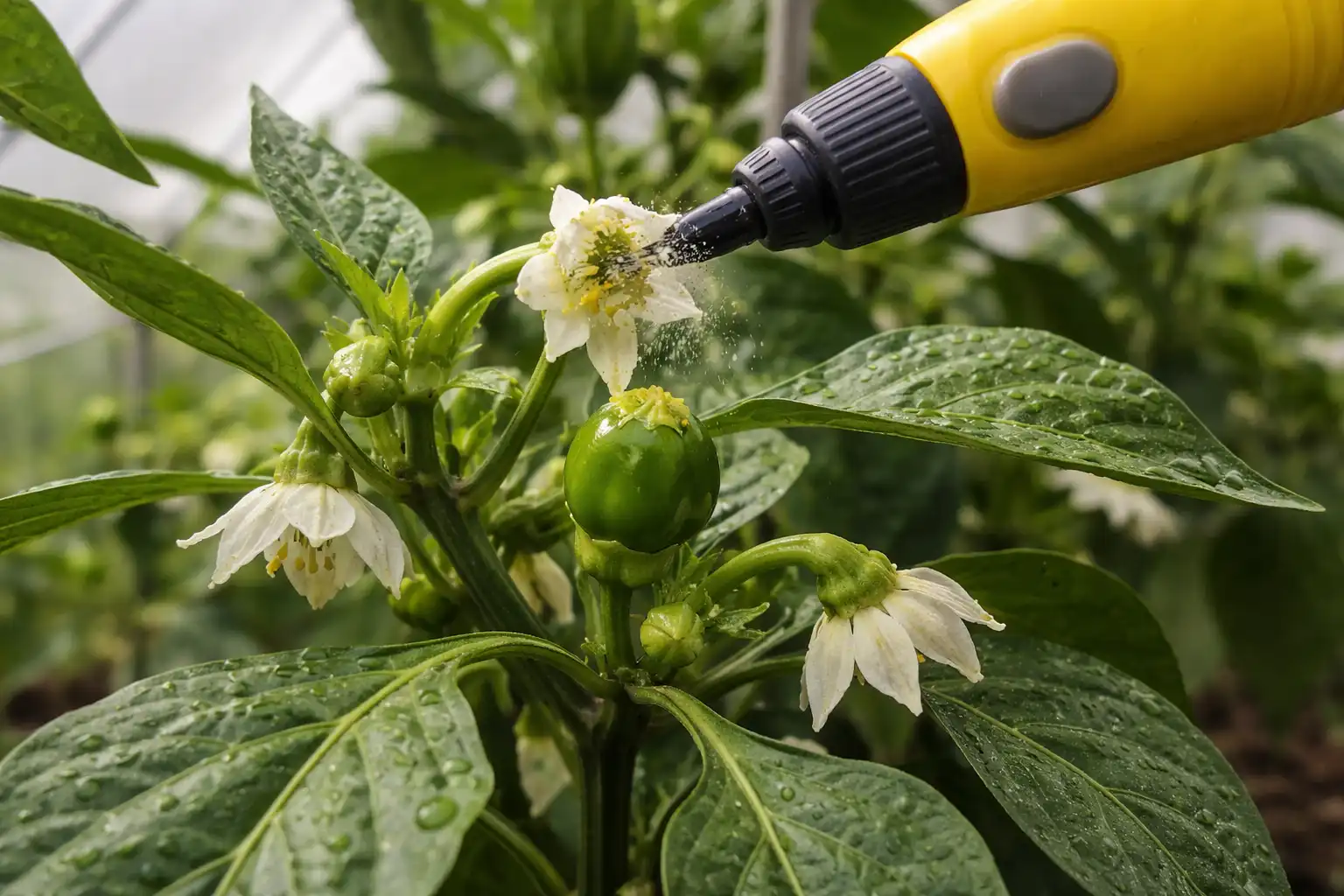 Om du ger dina paprikor en stabil temperatur utan plötsliga toppar och hjälper pollenet att komma till pistillen med en enkel skakning, kommer skörden att garanteras även utan användning av komplex kemi.