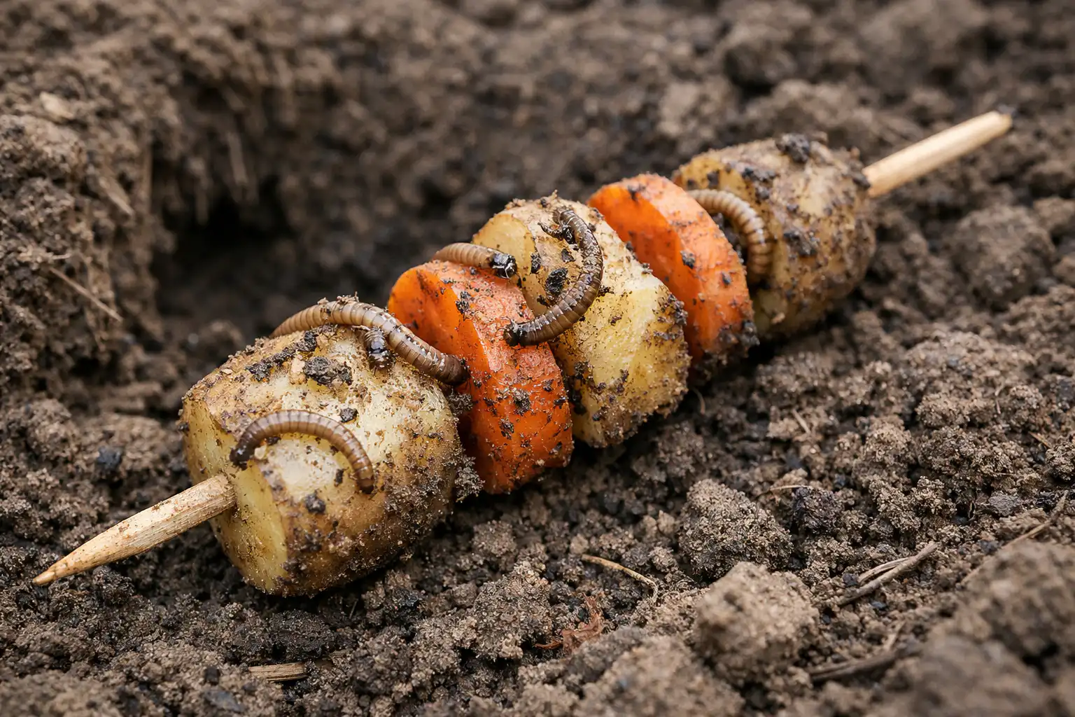 Använda rotfruktsbeten. Skär gamla potatisar eller morötter i stora bitar och stick dem på träspett.