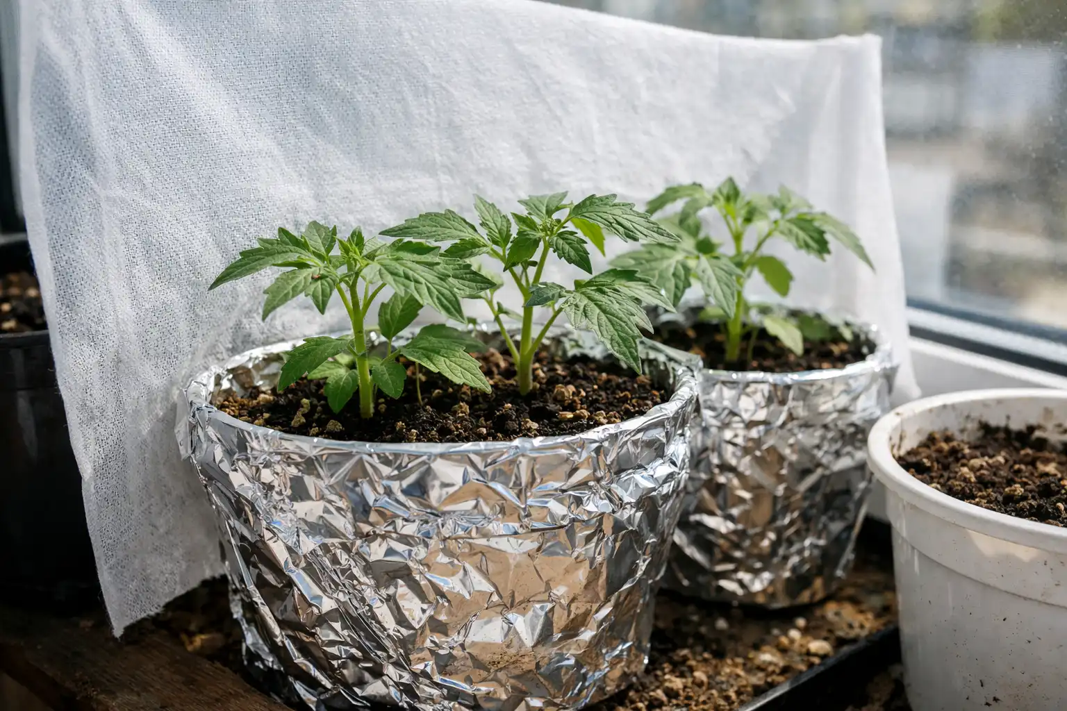Packa in krukorna i vanlig folie eller vitt papper för att reflektera strålarna.