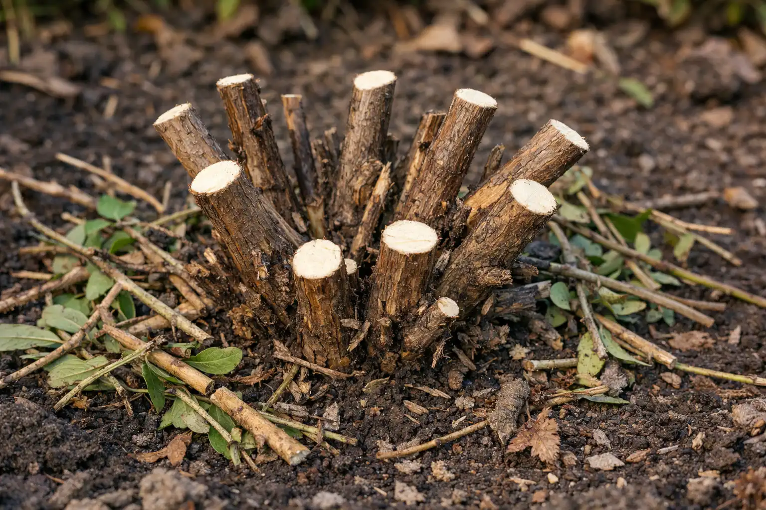Jag samlar alltid in alla sticklingar och tar bort dem från platsen efter att arbetet är klart. Det här är ett enkelt sätt att bli av med övervintrande bladluslarver och svampsporer utan kemikalier. Hösten Sanering ersätter flera steg av källbehandling.