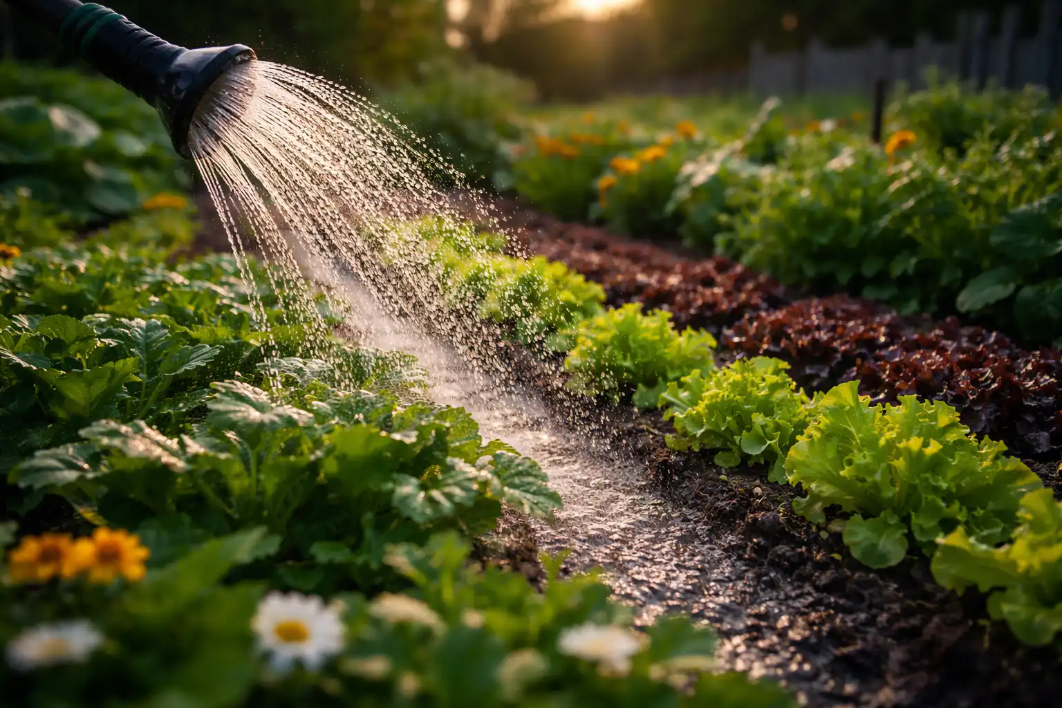 Kvällsvattning är det mest naturliga sättet att hålla en köksträdgård vid liv.