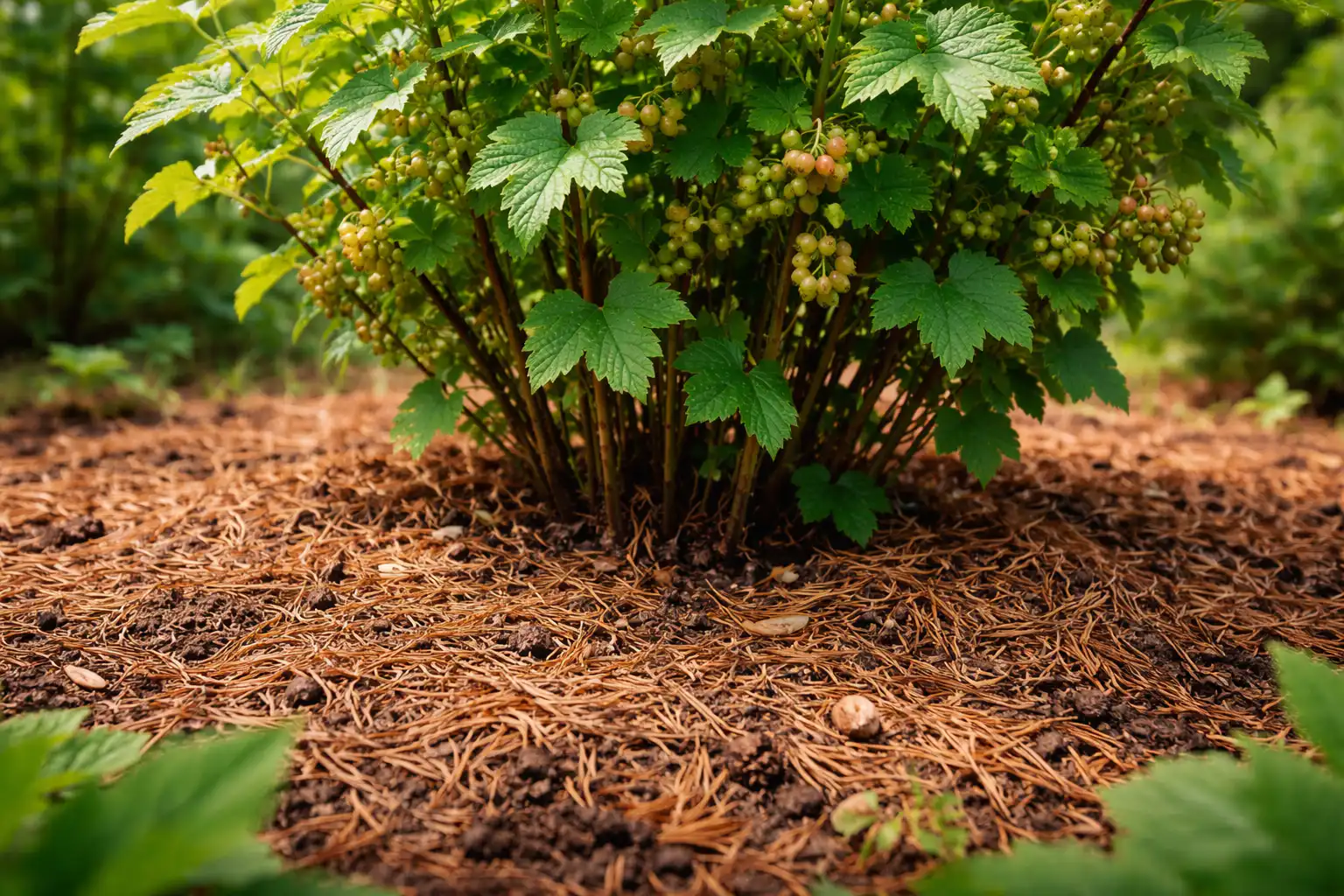 Hallon и vinbär – tallnålsmassan behåller den lösa jorden som dessa buskar älskar så mycket.