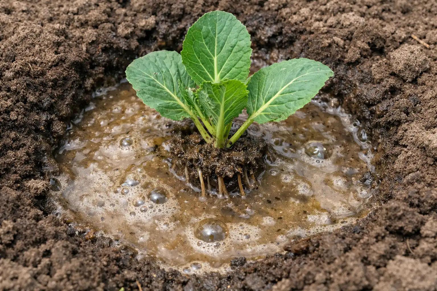 Hemlighet: Lägg till en handfull vanlig vedartad jord i varje hål. askblandas med jord. Detta ger inte bara näring åt kålen utan skapar också en skyddande barriär mot rotröta och kotyledonersom ofta attackerar försvagade växter vid stress.