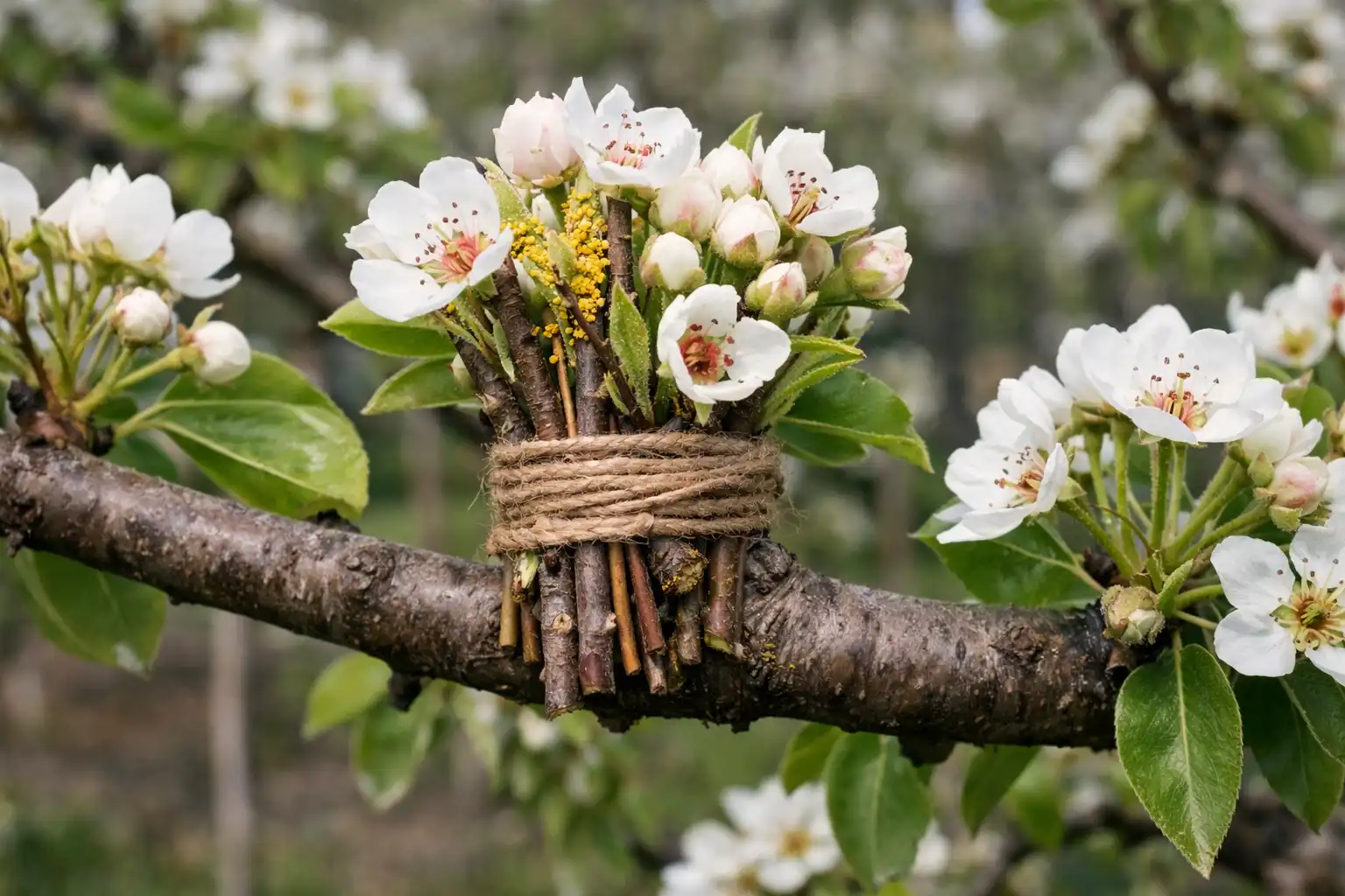 Detta är min favorit leafhack som fungerar 100% av tiden. Om du inte har plats för ett andra träd kan du använda en tillfällig pollinatör. Idén är enkel: när ditt päronträd börjar blomma, klipp några blommande grenar av en annan sort från grannens träd eller i skogen (vilda päronträd är en fantastisk pollinatör). Pollendonator).