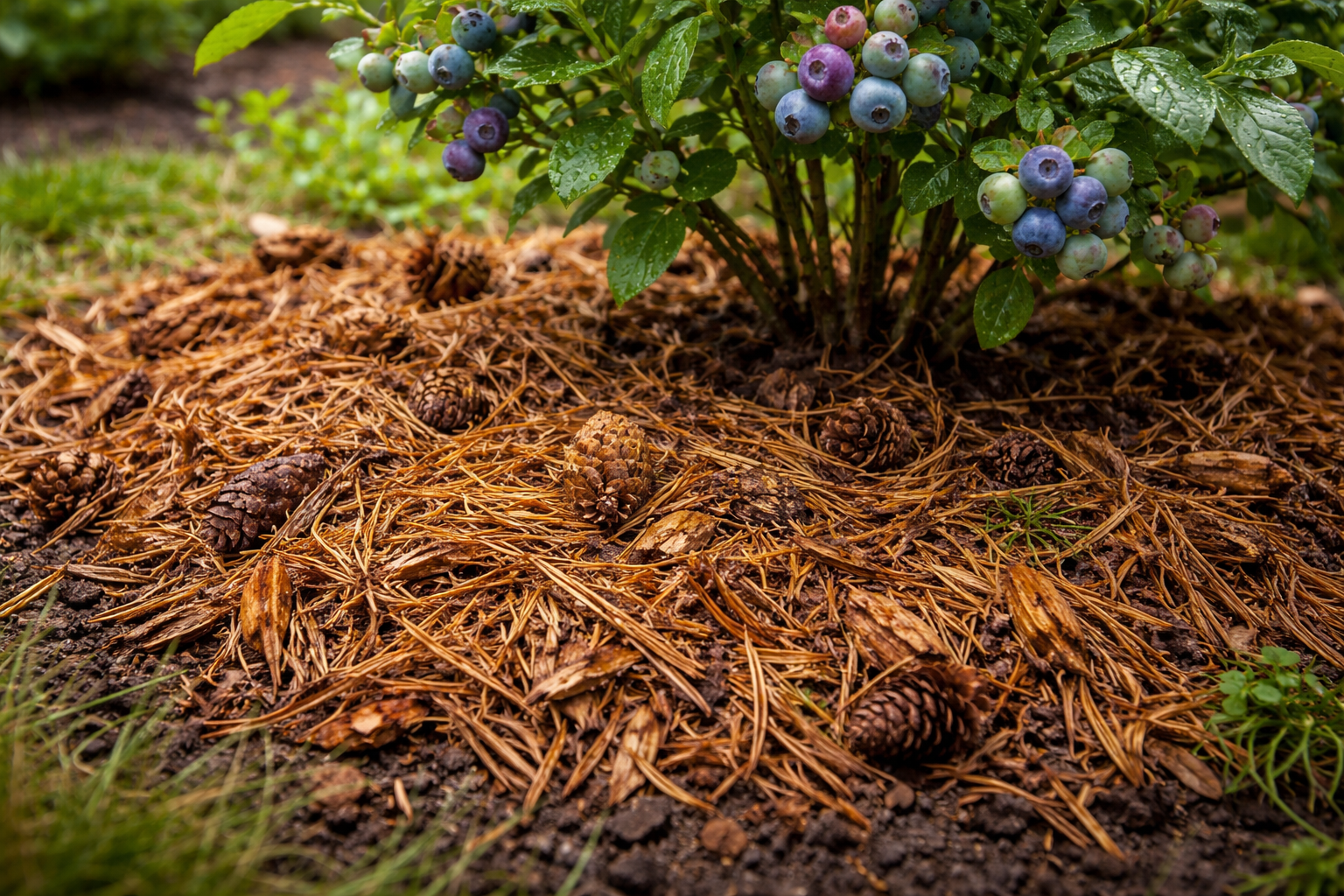 ”En viktig nyans: om du använder färska, ljusgröna fallna barr, se till att tillsätta lite kvävegödsel under buskarna, eftersom färska barr tillfälligt kan ta kväve från jorden när de bryts ned.”