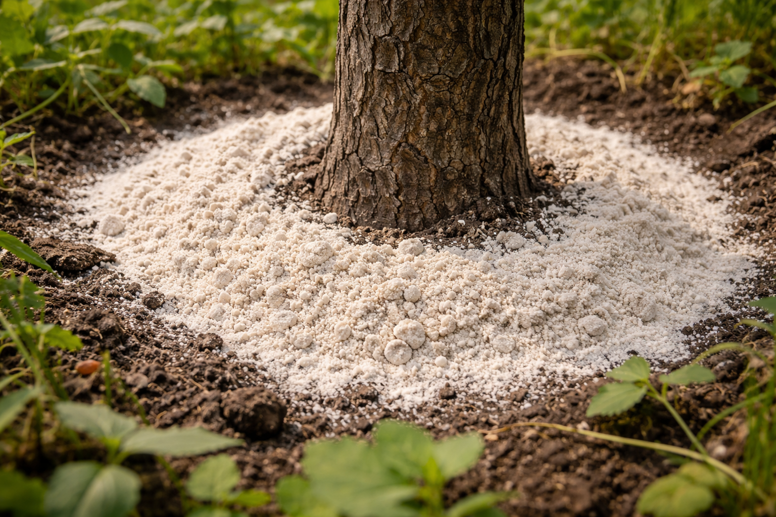 Förutom att avoxidera är detta mineral effektivt för att kontrollera vissa markskadegörare. De fina partiklarna i mjölet bryter ner kitinhöljet trådmask och insektslarver som övervintrar under plommonträdet. Detta är ett utmärkt sätt att kombinera trädnäring och milt biologiskt skydd av fruktträdgården utan att använda starka kemikalier.