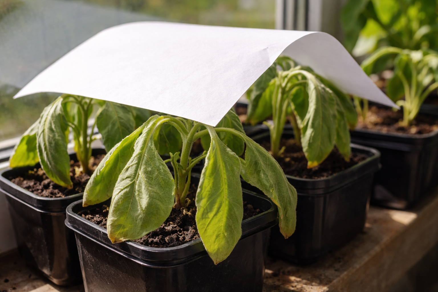 – Auberginer hatar dam i starkt solljus. – Direktstrålning genom glaset fungerar som en lins. – Torvkrukor i solen torkar ut direkt och drar fukt från rötterna. – Brist på jordvolym gör att växten ”ger upp” på ett par timmars värme.
