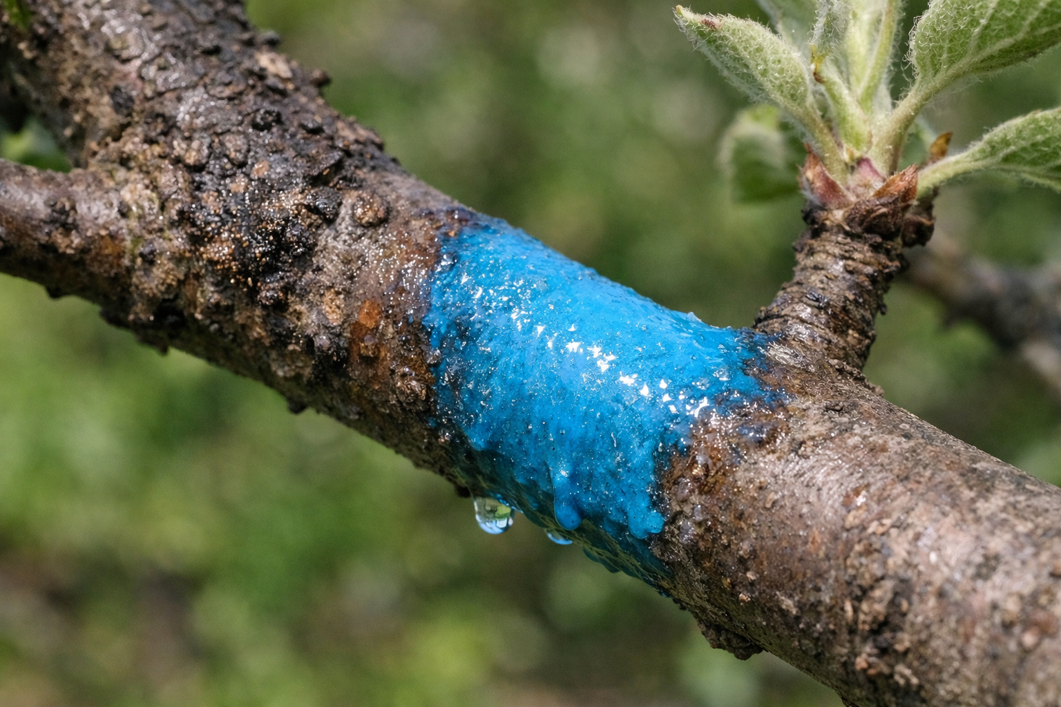 Barken på ett friskt äppelträd får en knappt märkbar blåaktig färg efter vårbehandlingen.