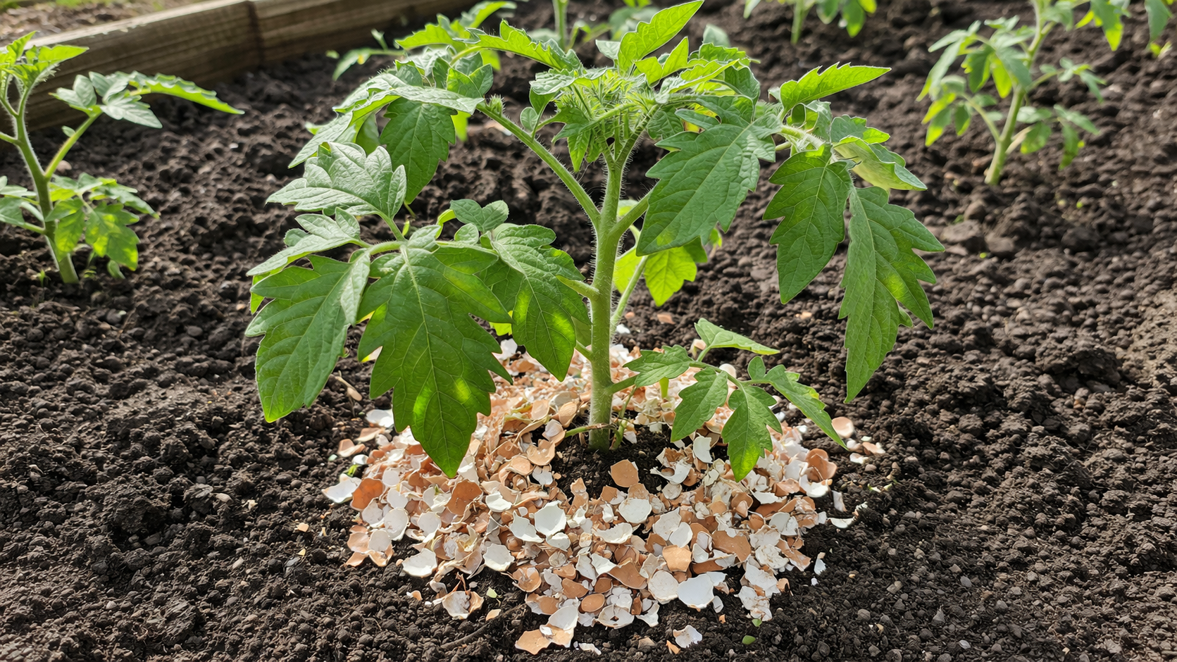 På våren är jorden ofta övervattnad och försurad, vilket blockerar assimileringen av kväve. Äggdamm fungerar som en mild deoxiderare. Till skillnad från kalk- eller dolomitmjöl verkar det gradvis utan att bränna tomaternas känsliga rötter.