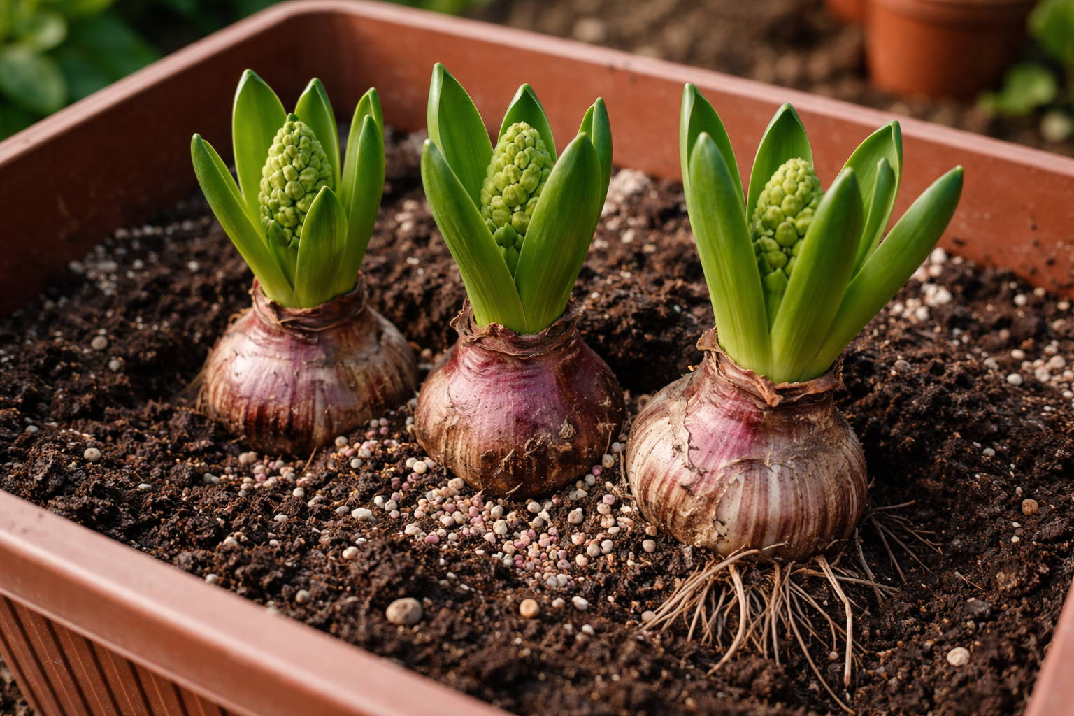 En hemlig nyans: för att säkerställa att hyacinterna sätter en pil, efter att blommorna har bleknat (men innan bladen blir gula), bör kaliumsulfat tillsättas. Detta signalerar till växten att det är dags att bilda en knopp för nästa år.