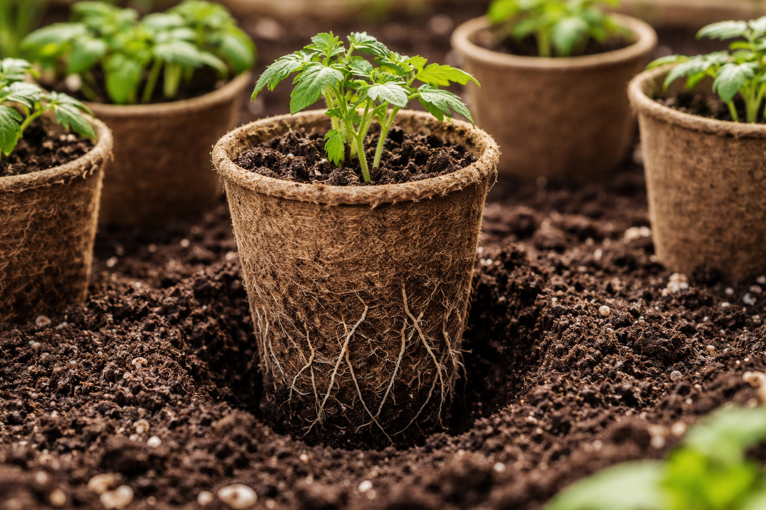 Fördjupa alltid plantan så att det bördiga jordlagret täcker torvbehållarens övre kanter med minst ett par centimeter.