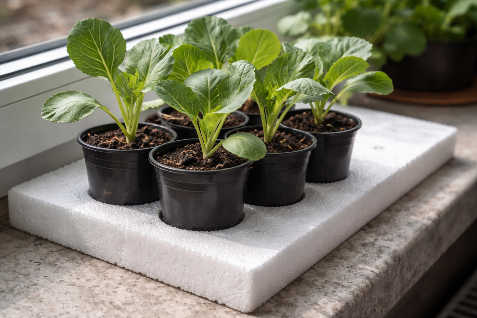 Hemlig nyans: huvudnyckeln till en stark kål ligger i att skapa effekten av ”kalla fötter” genom att lägga en bit vanlig skumplast på fönsterbrädan, som på ett tillförlitligt sätt isolerar ömma rötter från den heta värmeelementet.