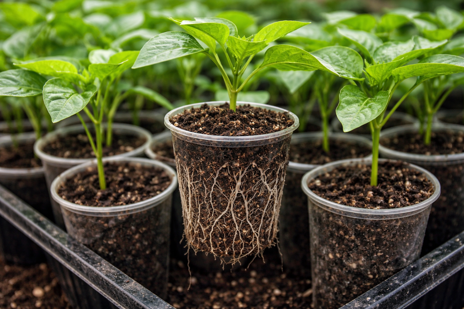 Min främsta hemlighet: flytta paprikorna till en ny behållare först när rötterna börjar titta ut ur dräneringshålen, och öka behållarens volym med bara ett par centimeter i diameter.